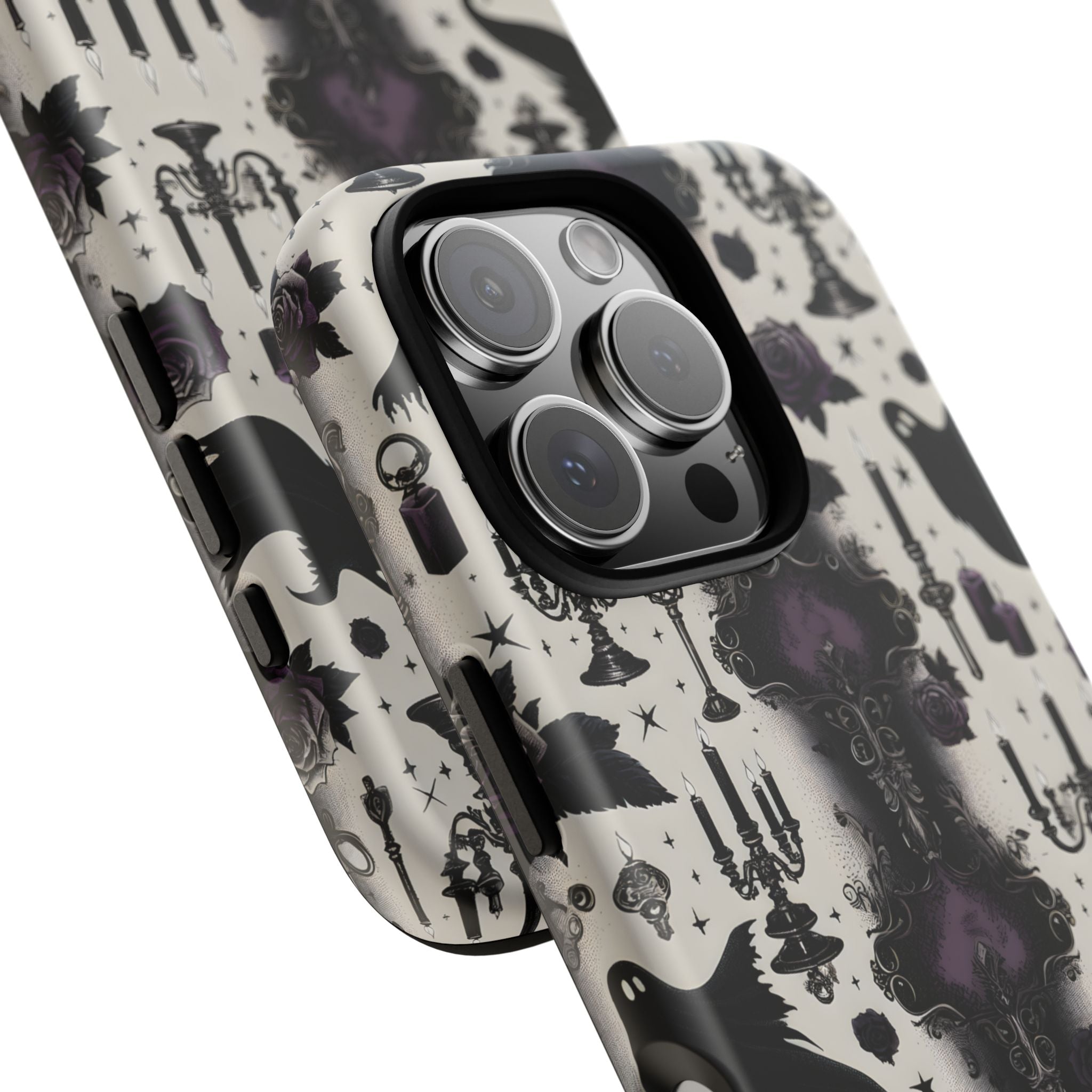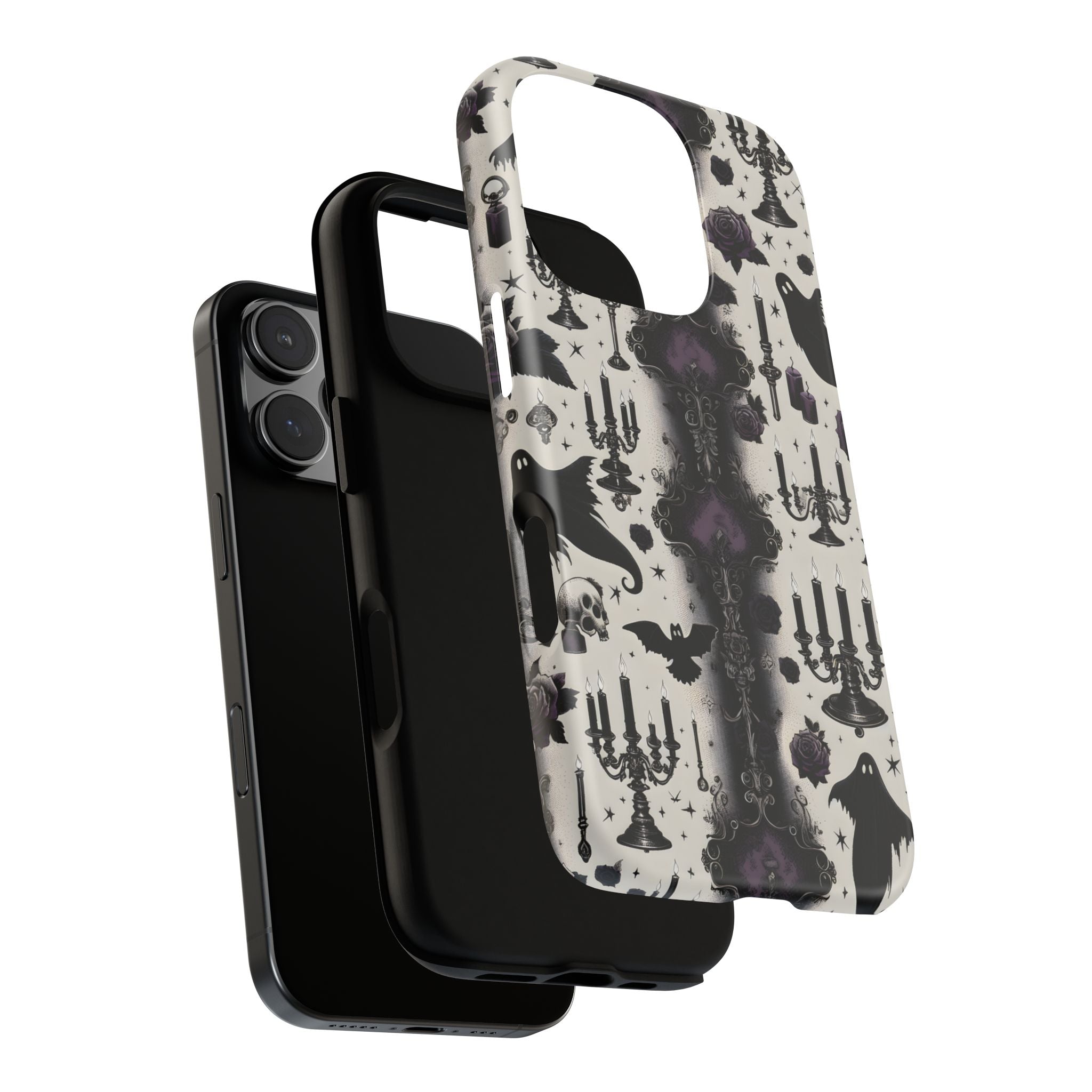 Dieses kunstvolle Halloween-Design vereint geheimnisvolle Geister, leuchtende Kerzenleuchter, violette Rosen und verschnörkelte Ornamente zu einem eleganten Gothic-Motiv. In einer harmonischen Farbwelt aus Schwarz, Grau und Violett entsteht eine edle, mystische Atmosphäre voller Stil und Charakter. Die Hülle ist ideal für alle, die Halloween lieben, aber statt verspielter Motive ein edles, dunkles Design bevorzugen. Sie verleiht deinem iPhone einen einzigartigen Vintage-Gothic-Look – perfekt für die gruselige Jahreszeit und alle Liebhaber ästhetischer Details.
