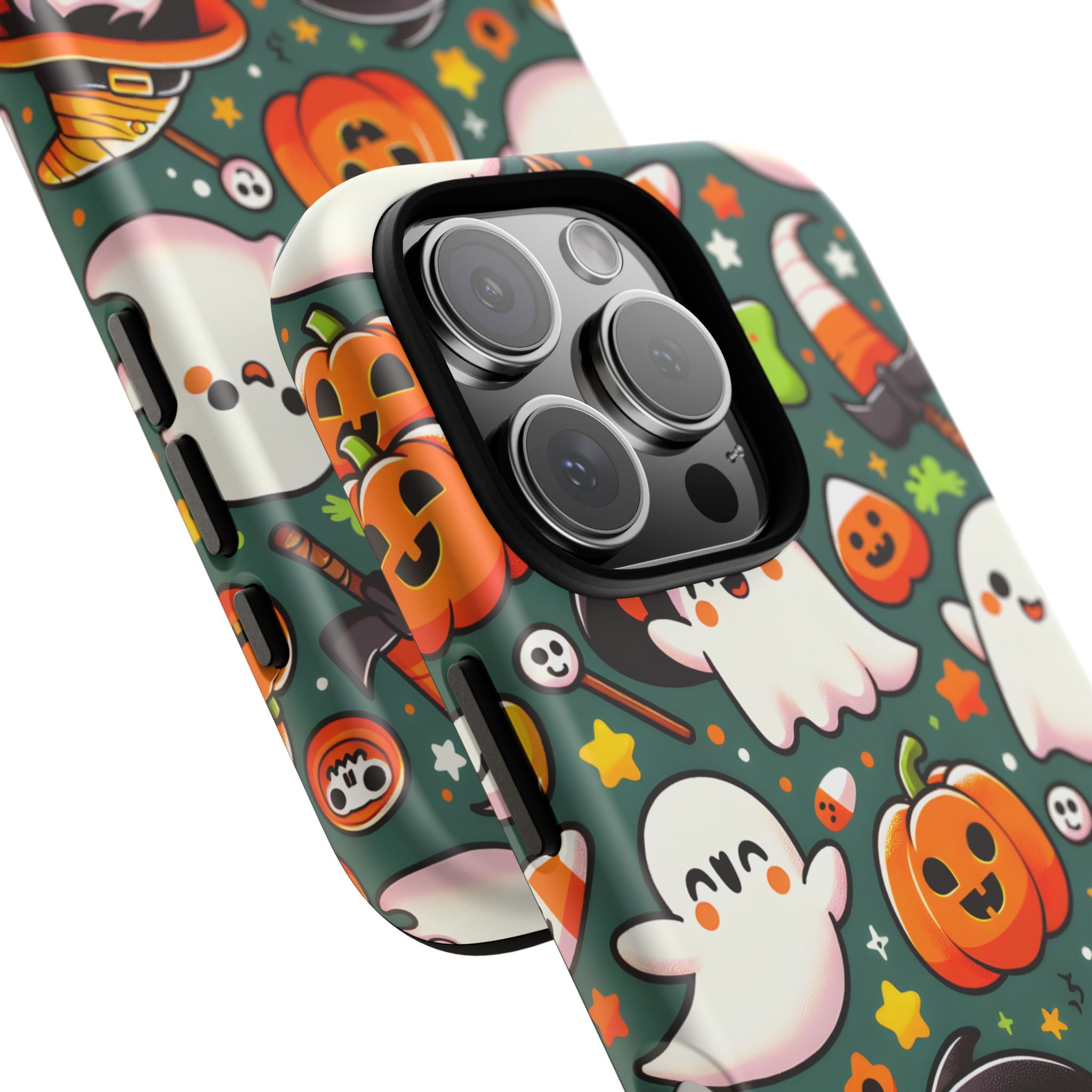 Dieses fröhliche Halloween-Motiv zeigt eine Vielzahl kleiner Geister, Kürbisse, Zauberhüte und Süßigkeiten, die sich auf einem dunkelgrünen Hintergrund tummeln. Die Kombination aus leuchtendem Orange, Weiß und Grün schafft eine verspielte, warme Atmosphäre voller Festtagsfreude. Die Hülle bringt gute Laune in die gruselige Jahreszeit und verleiht deinem iPhone einen charmanten, süßen Look. Ideal für alle, die Halloween lieben, aber ein niedliches und farbenfrohes Design bevorzugen – perfekt als Hingucker und Geschenkidee.