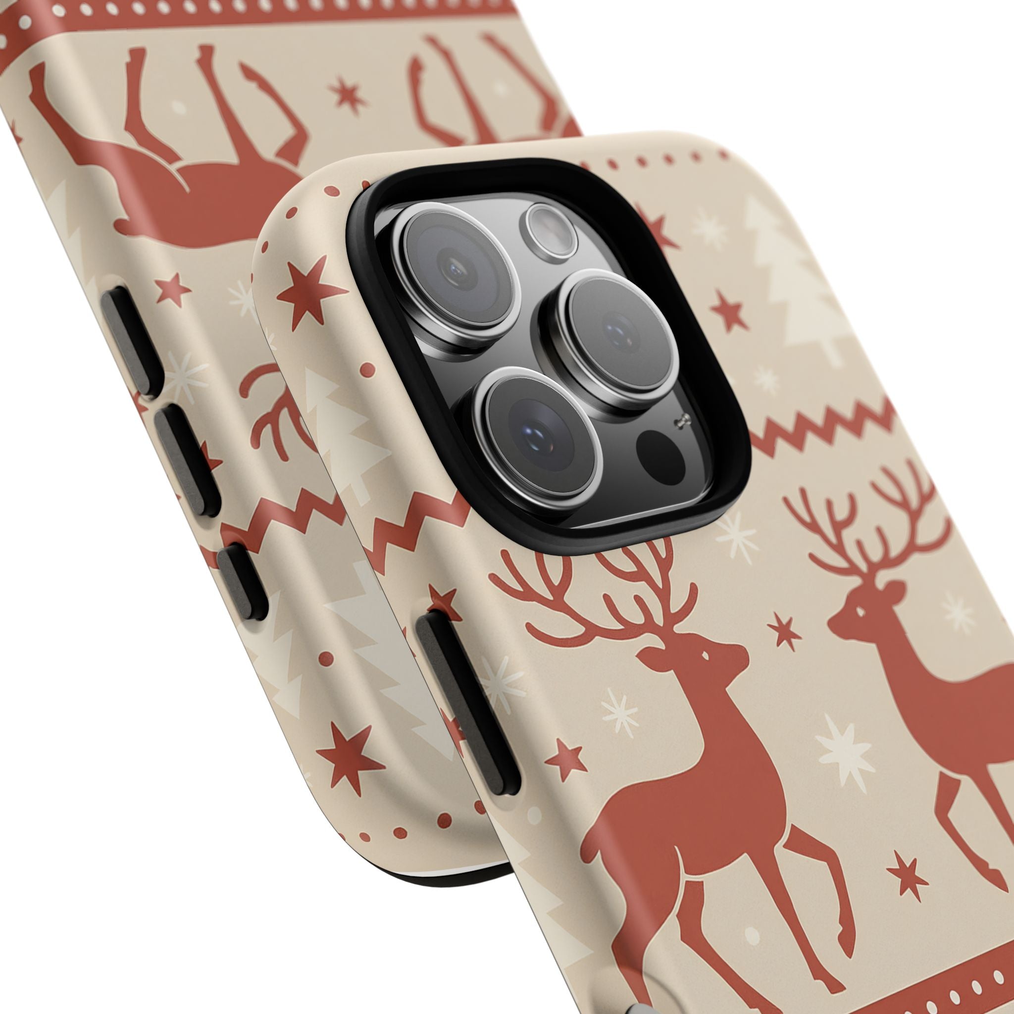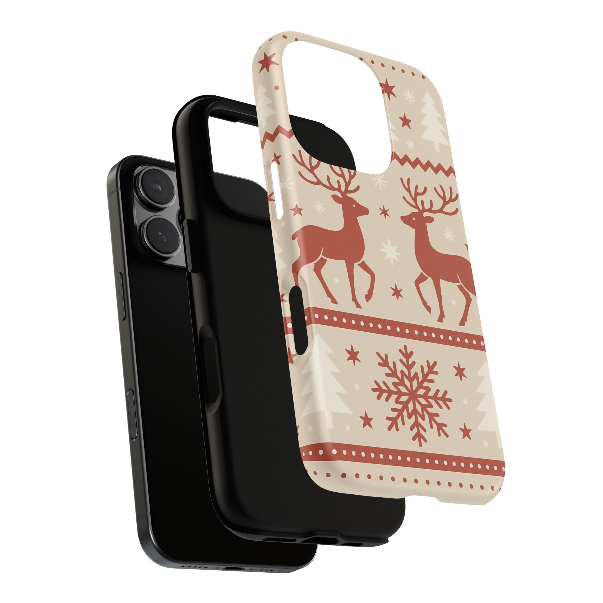 Dieses elegante Weihnachtsdesign zeigt ein harmonisches Muster aus Rentieren, Schneeflocken, Tannenbäumen und Sternen in warmen Rot- und Beigetönen. Inspiriert vom skandinavischen Stil vermittelt es eine ruhige, festliche Atmosphäre – perfekt für die Winter- und Weihnachtszeit. Die Hülle verleiht deinem iPhone einen stilvollen, saisonalen Look und bringt festliche Gemütlichkeit in deinen Alltag. Ideal für alle, die klare Formen, nordische Designs und den Zauber von Weihnachten lieben.